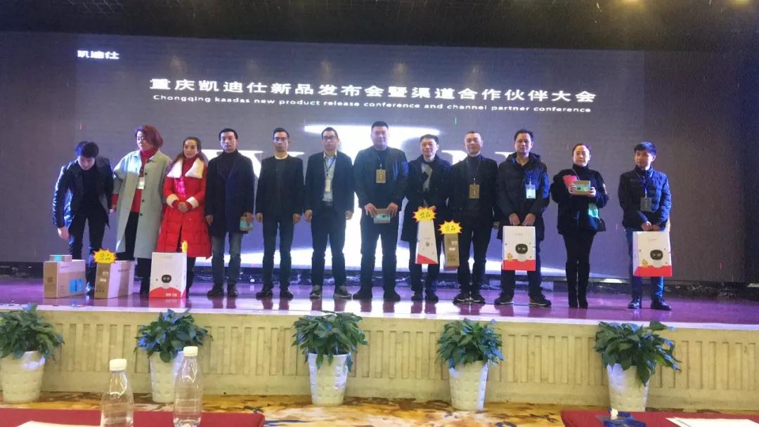 在隨后的經銷商頒獎儀式上,凱迪仕呂總、冷總和重慶凱迪仕胡總分別為金牌經銷商頒發了證書和獎品。幾位優秀分銷商代表也在臺上分享了自己的經驗和銷售技巧。在場其他合作伙伴也進行了經驗交流,同心同力,共贏未來。