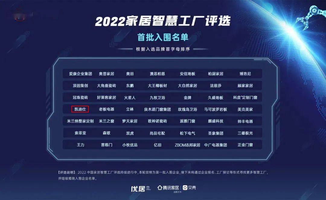 為展示家居工業科技之美,為廣大家居企業搭建一個探索工業4.0學習交流的平臺,優居、騰訊家居·貝殼發起“2022尋找智慧工廠”活動,凱迪仕榮登2022家居“智慧工廠”首批入圍名單,也是智能鎖行業唯一上榜品牌。