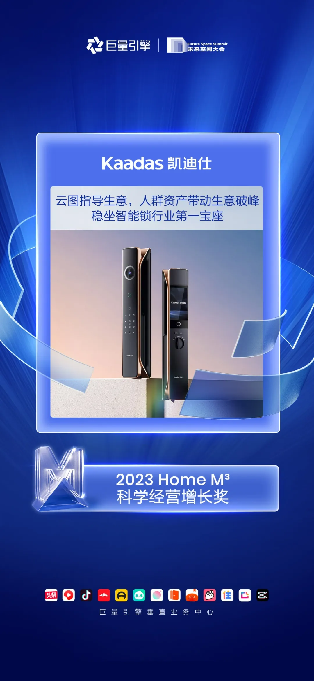 「2023 Home M³·科學經營增長獎」獎項,旨在表彰深入研究巨量引擎科學營銷,在云圖使用、數據接入和營銷、后鏈路轉化技術對接等,有突出表現的品牌。Kaadas凱迪仕獲得“云圖指導生意,人群資產帶動生意破峰,穩坐智能鎖行業第一寶座!”的官方評價,品牌實力備受認可!